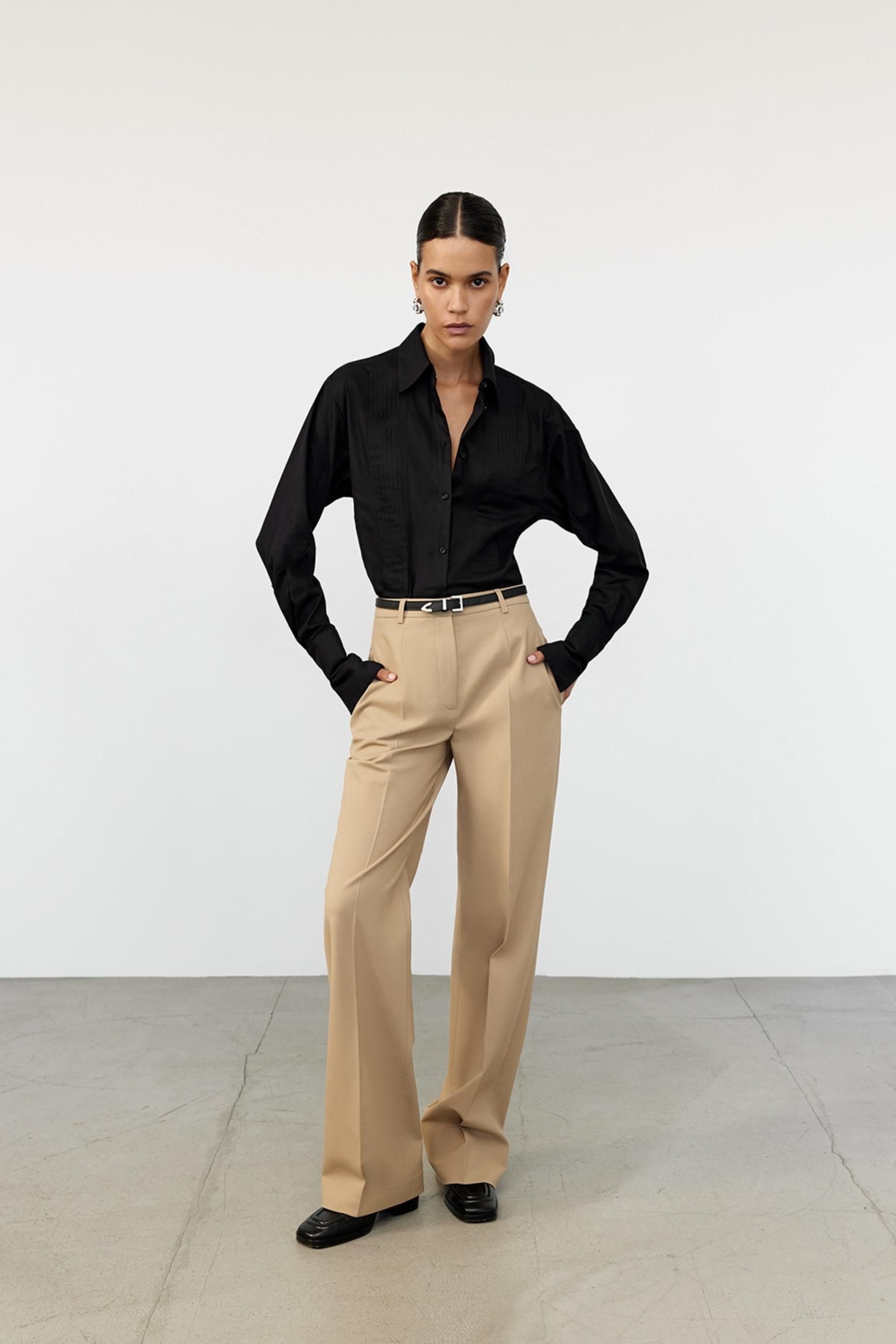 Классические брюки прямого силуэта с высокой талией. Самая комфортная версия наших моделей: облегающая посадка на линии бедер и точные прямые линии кроя от колен. На задней поверхности размещены карманы, конструкция которых напоминает форму японских интерьерных ширм сёдзи, отмечая принадлежность модели к мотивам коллекции. Ткань — полотно с шерстью virgin wool: в чистом виде тактильно напоминает кашемир, а в составе делает материал исключительно износостойким и наделяет изделие деликатным лоском. Брюки идеально подойдут к жакету прямого кроя из идентичной ткани.